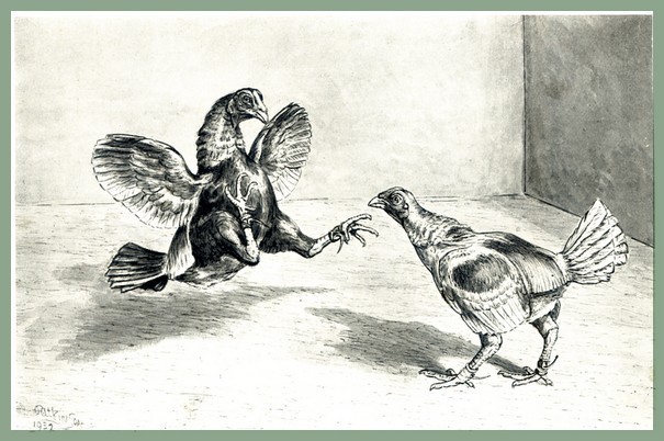 On reproduit dans un gallodrome une scène fréquemment observée dans toute vraie basse-cour ,à savoir un