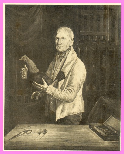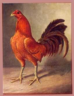 G. à D. : Combattant anglais , type ancien ( Old English Game ) gravure du Feathered World -