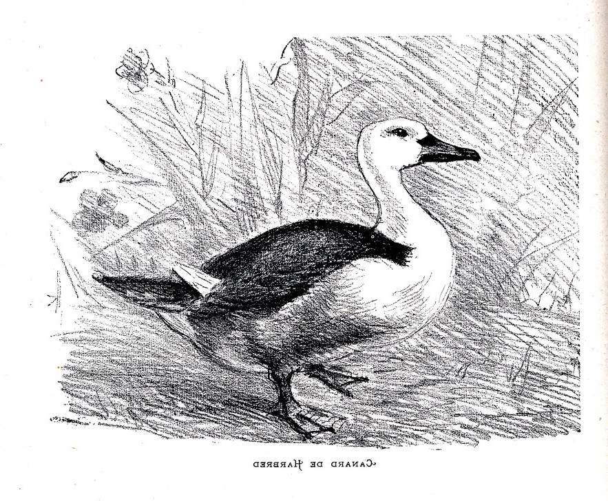 Or, le canard de Harbred a la tête, le cou et la poitrine d'un blanc pur ; une bande blanche étroite se continue scus le ventre et sous la queue, tout le reste du plumage est plus ou moins noir.