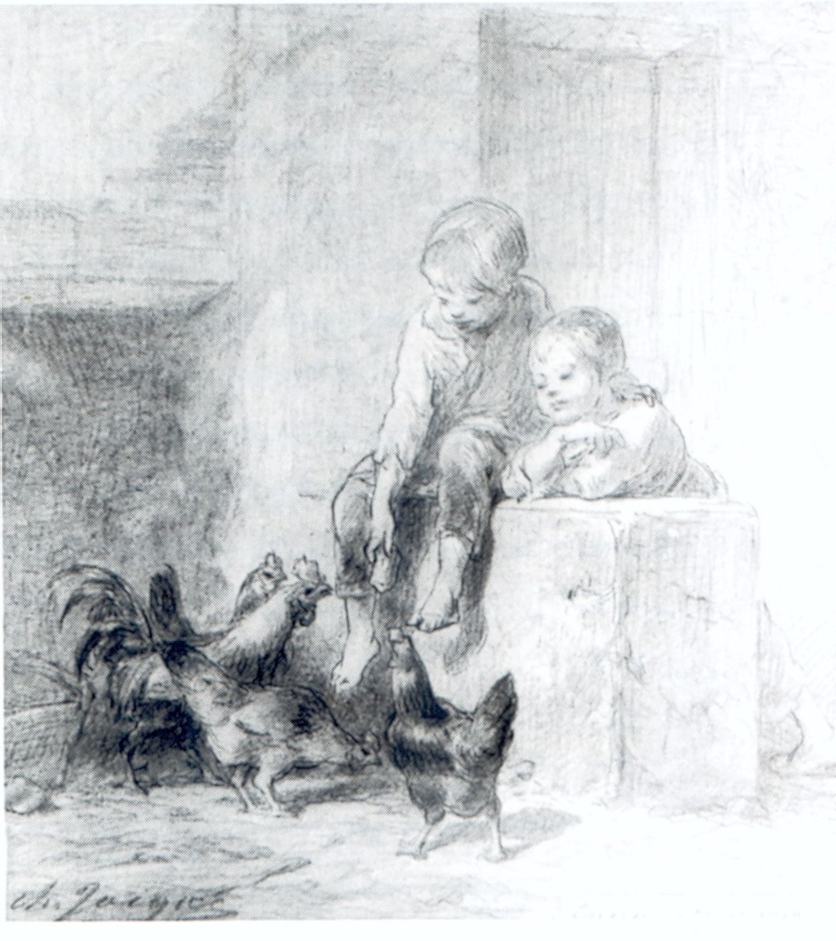 De gauche à droite : Marie et Emile ( enfants de C.Jacque ) donnant à manger à des poules - Coq et poules ( Musée des Beaux Arts de Troyes ) - La Grande Bergerie , eau forte , 1859