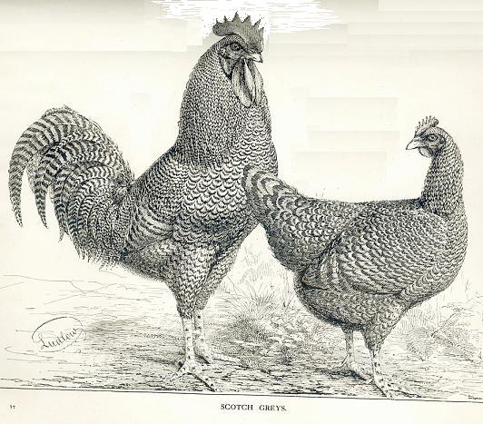sa présence dans le Scotch Grey, pour moi, est une indication d'un croisement soit avec le Plymouth Rock, le Cochin coucou , le Game, ou d'un quelconque sang asiatique.